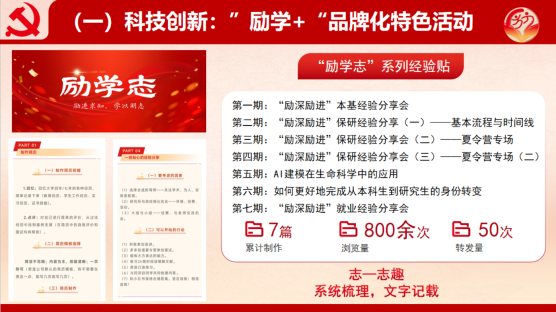 在科技创新方面,支部打造了三大“励学 +”品牌活动:“励学杯”课题对抗赛将党的理论知识与学科发展相结合,设置多个赛道,锻炼支部成员学术思考、创新表达和团队协作等多方面能力,已连续举办 4 届,反响热烈。“励深励进”经验分享会聚焦本科生学业科研需求,邀请优秀学长学姐分享经验,助力学生科研能力提升。“励学志”系列经验帖以实用信息分享为核心,以成长引领为目标,累计推出 7 期,阅读量800余次。