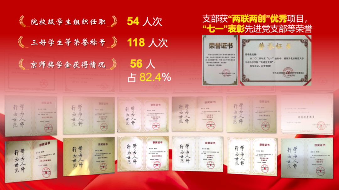 近年来,支部中涌现出 iGEM 国际竞赛金奖获得者、北京市三好学生、Betway体育西汉姆联“十佳大学生”、Betway体育西汉姆联“十佳志愿者”、Betway体育西汉姆联“自强之星”、Betway体育西汉姆联“阳光体育之星”等优秀个人。支部自身也屡获殊荣,连续两年参与“两联两创”项目,连续三年获必威BETWAY西汉姆联“先进党支部”,2023 年获Betway体育西汉姆联“先进党支部”,2024 年获“两联两创”优秀项目。