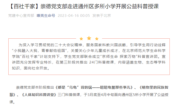 必威BETWAY西汉姆联崇德党支部由生态学和生物学硕士研究生组成。“崇德”源于孔子颜渊篇“主忠信,徙义,崇德也”,支部以“崇德向善,以身践行”作为核心精神,要求成员在实践中提升自我、在奉献中温暖他人。 习近平总书记指出,科技创新、科学普及是实现创新发展的两翼,要把科学普及放在与科技创新同等重要的位置,没有全民科学素质普遍提高,就难以建立起宏大的高素质创新大军,难以实现科技强国。党的二十大报告给予广大青年“坚定不移听党话、跟党走,怀抱梦想又脚踏实地,敢想敢为又善作善成,立志做有知识、有能力、能吃苦、肯奋斗的新时代好青年”的嘱托。支部成立一年来,通过与8所小学和一个社区的红色“1+1”共建,在全国推广特色科普课程,以志愿服务之行助力国家青少年科学素养提升。 支持科教兴国战略 全面加强科普实践 依托“双一流”学科优势,支部深入科学中心、金融街科普基地、通州区各小学开展科普,助力首都科普工作与城市副中心建设,并面向广东、江西开展线上科学课堂。围绕动物保护、民族植物、人体健康,面向800余名青少年开展10余场科普活动。事迹在通州区教委及各中小学公众号报道11次,阅读量超过1400次。成员精心筹备“格物致知”科普周活动,举办专家讲座2场,开放科普基地3个,收集科普微视频、科普展板、科普漫画等作品30余个。该项工作被学习强国报道。同时支部创新丰富公益科普形式,支部成员以志愿者的身份加入市金融街青教活动服务保障、百花山国家级自然保护区科普宣教活动,并助力学院获评“全国科普工作先进集体”、“2021—2025年第一批全国科普教育基地”。