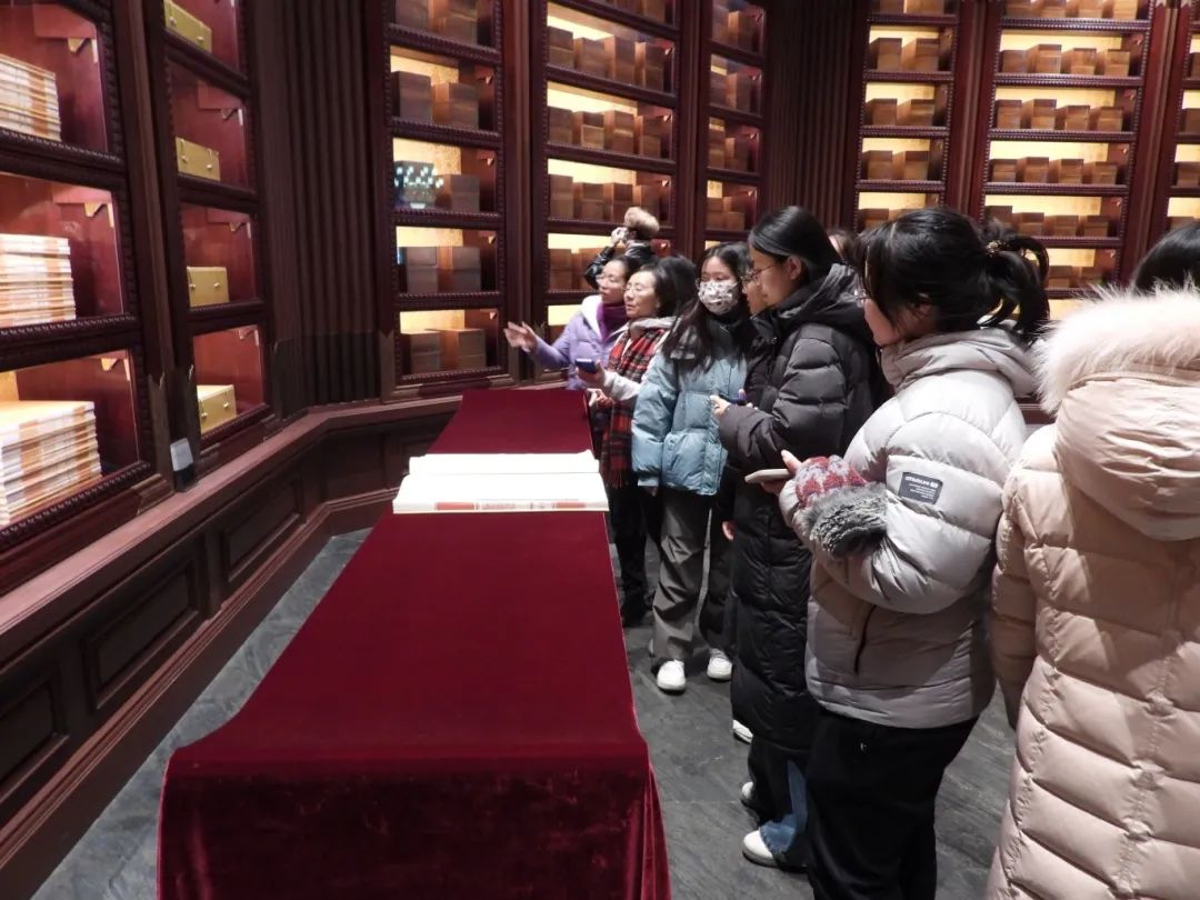 最后,师生们在文瀚阁参观了以马克思主义发展史为核心的展览。这里陈列着2000多件珍贵展品,包括经典版本、手稿和档案资料,全面展现了马克思主义在中国的本土化和时代化成果。站在诸多马克思主义中国化的珍贵文件前,师生们仿佛穿越时空,重温那段波澜壮阔的历史。此外,他们还在文瀚厅内欣赏了《四库全书》《永乐大典》《古今图书集成》等古籍的原雕版刷印本和仿真影印本,深刻感受到了历史的深度和在中国共产党领导下的文化自信。