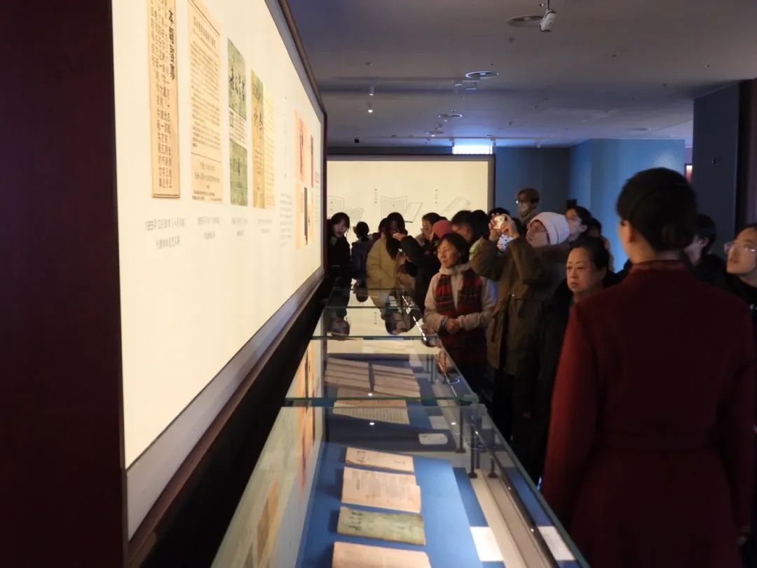 随后,师生们依次参观了文华堂内的两个专题展览:一层的“见证伟业——中华民族复兴版本展”通过实物和文献,生动再现了中国共产党引领人民走向国家富强的那段波澜壮阔的历程;二层的“斯文在兹——中华古代文明版本展”则让师生们深刻体会到了中华文明的丰富文化内涵。