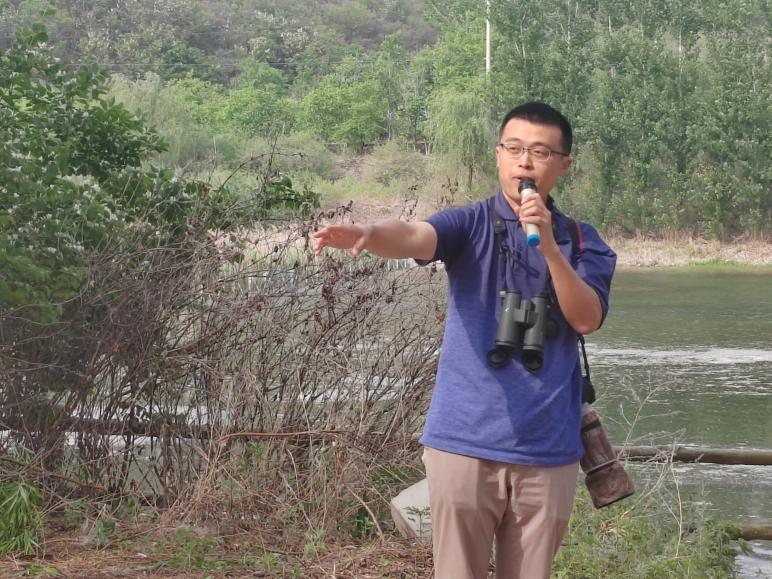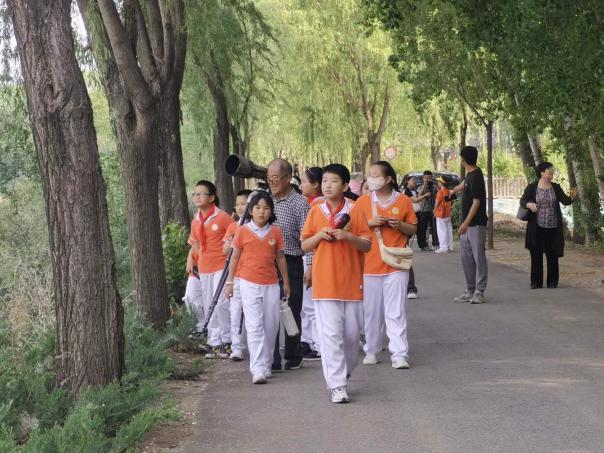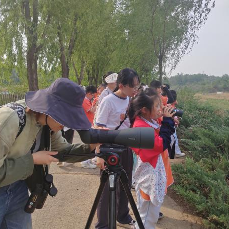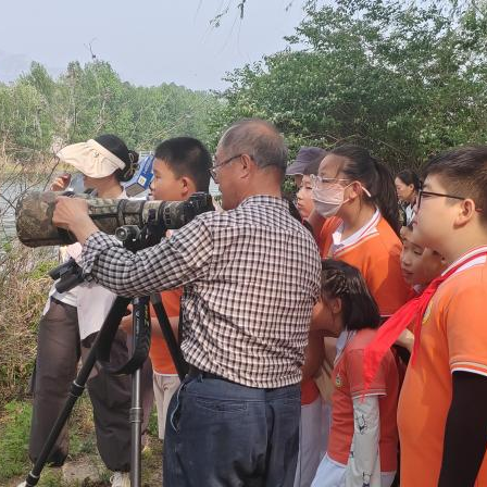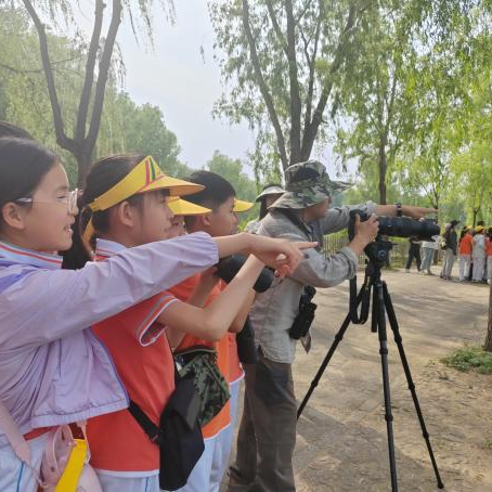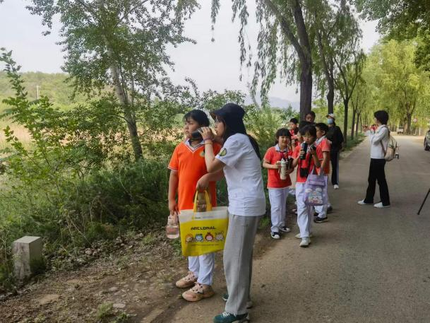 随后,观鸟导师带领各组依次出发,沿清水河溯流而上。一路上,各位导师向学生们悉心介绍出现在视野范围内的鸟类,引导学生通过单筒望远镜和摄像机拍摄到的画面,观察不同鸟类的形态行为特征,并简要介绍鸟类野外调查方式和密云常见鸟类的生活习性。每组学生助教负责维持队伍秩序,并耐心教小朋友们如何调试望远镜以看到清晰的图像,学生们通过望远镜捕捉到空中快速掠过的鸟群时,顿感兴奋不已。