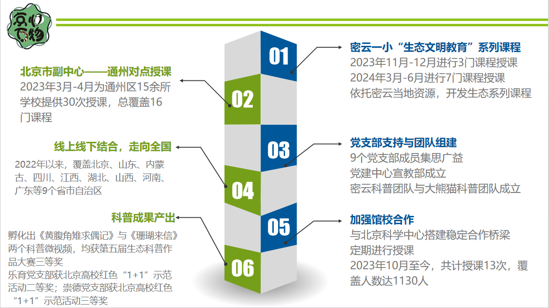 学院开发了与密云一小合作的“生态文明教育”系列课程,累计进行10门课程授课;在北京市的副中心——通州区开展30次授课,总共覆盖16门课程;同时,与北京科学中心搭建稳定的合作桥梁,定期进行授课。