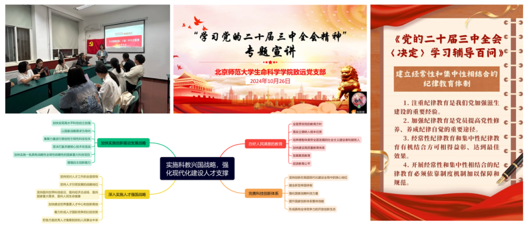 党支部于2024年8-11月开展党的二十届三中全会会议精神专题学习,致远党支部与励学党支部一同开展主题研讨会,共绘思维导图,制作学习海报,党支部还邀请到马克思主义学院求索学社宣讲团的樊奕聪、任紫莹两位同志作为主讲人,与各位同志共讲共学党的二十届三中全会精神。