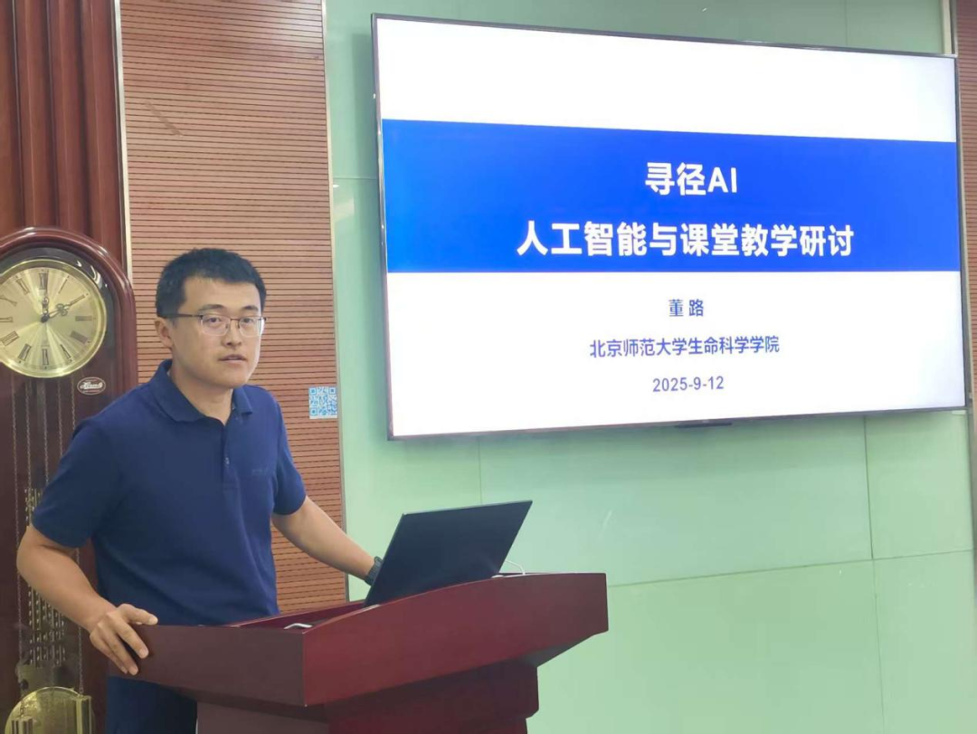 副院长董路教授以《寻径AI 人工智能与课堂教学研讨》为题,分享了在课堂教学中融入人工智能技术的实践探索与思考,并建议制定面向教育教学场景的人工智能使用行为指南,通过建立规范、明晰边界,引导师生合理、有序应用,使人工智能真正服务于学生批判性思维、创新能力的提升。