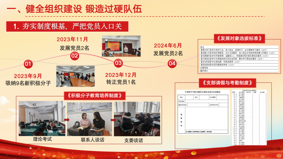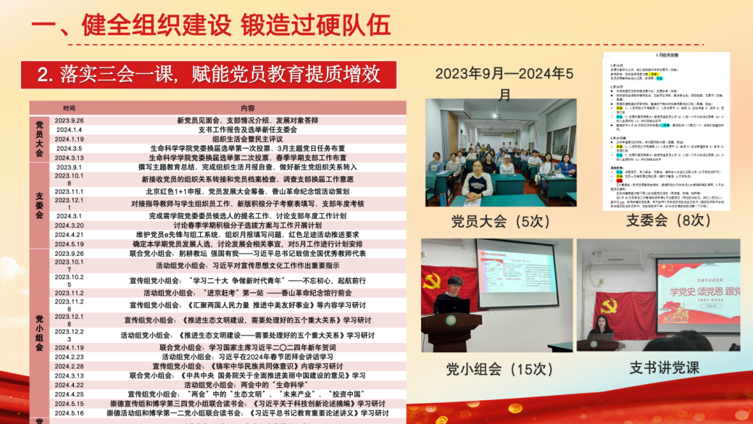 支部持续健全组织建设,2023年9月至今,发展党员4名,按期转正党员1名,吸纳9名新积极分子,出台《请假与考勤制度》、《发展对象选拔标准》等。落实三会一课,召开5次党员大会、8次支委会、15次党小组会及主题党课,赋能党员教育提质增效。同时强化政治引领。一是做好“五个学”,通过学理论、学榜样、研讨学、参观学、实践学,实现教育“走新”更“入心”。二是围绕党纪学习,成员研读《条例》、参观法院博物馆、聆听党纪主题党课、观看党纪电影,使得主题教育更系统、更有实效。三是依托标杆院系示范引领作用,立足“三个服务”,开展各层级共建。服务全校师生,联合外文博学党支部开展“我为师生办实事”等“两联两创”活动;服务乡村振兴,联合密云一小将生态教育带入郊区;服务社区儿童,将金融街志愿服务常态化。