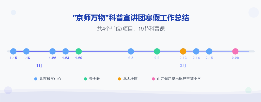 为深入学习贯彻习近平新时代中国特色社会主义思想,扎实推进“永远跟党走”主题教育活动,全面贯彻党的二十大和二十届三中全会 精神,积极响应北京高校红色“1+1”活动号召,认真落实“我为群众办实事”实践活动要求,依据中共中央、国务院印发的《教育强国建设规划纲要(2024—2035年)》关于科学教育的总体部署,立足生命科学学科特色,2025年1月15日至2月20日,“京师万物”科普宣讲团与北京科学中心、北太平庄社区以及山西省吕梁市岚县王狮小学开展合作对接,并与“中国梦·强师行”云支教项目合作,采用线上线下相结合的授课形式,为来自北京、山西及中西部省份的中小学生累计开展19次科普授课,总覆盖学生超过500名。在这个温暖的冬季,“京师万物”宣讲团将生物知识送到全国各地,带领师生在知识的海洋中共同遨游。