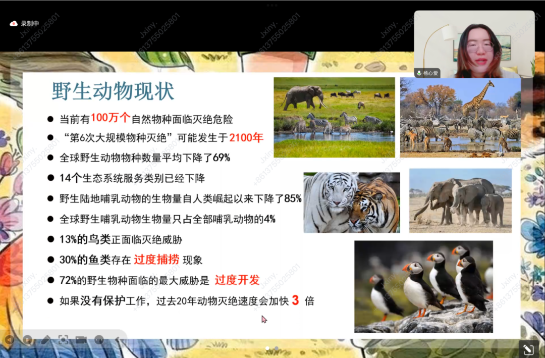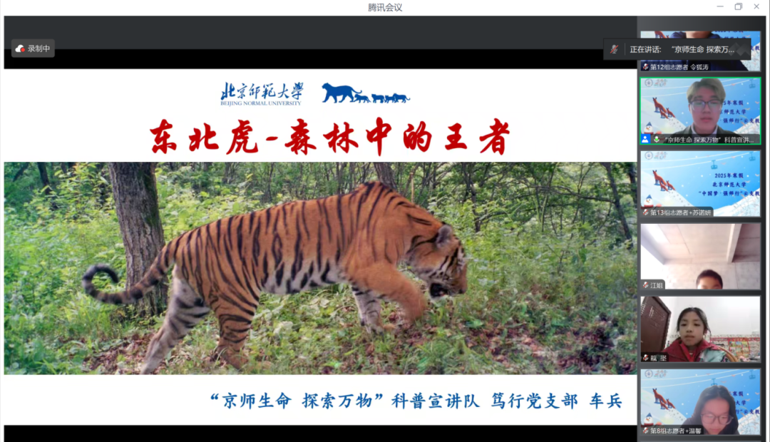 寒假期间,科普宣讲团与Betway体育西汉姆联“中国梦·强师行”项目合作,为中西部省份的中小学生带来了两节精彩的科普课。1月26日,车兵同志借助东北虎豹野外观测站生态大数据平台丰富的视频资料,向小学生介绍了东北虎的身体发肤、衣食住行和繁衍生息,让同学们对东北虎,这位森林中的王者,有了更深的认识。2月9日,洪梓涵同志以《鸟类繁殖季:一场生命交响乐》为主题,详细介绍了鸟类的繁殖生态学,特别是白头鹎的繁殖行为和筑巢习性。通过生动的案例和详实的数据,直观易懂地展示了鸟类在繁殖季节的复杂行为和面临的挑战。两场科普课课堂氛围活跃,学生们听得津津有味,激发了他们保护野生动物,爱护自然环境的热情。