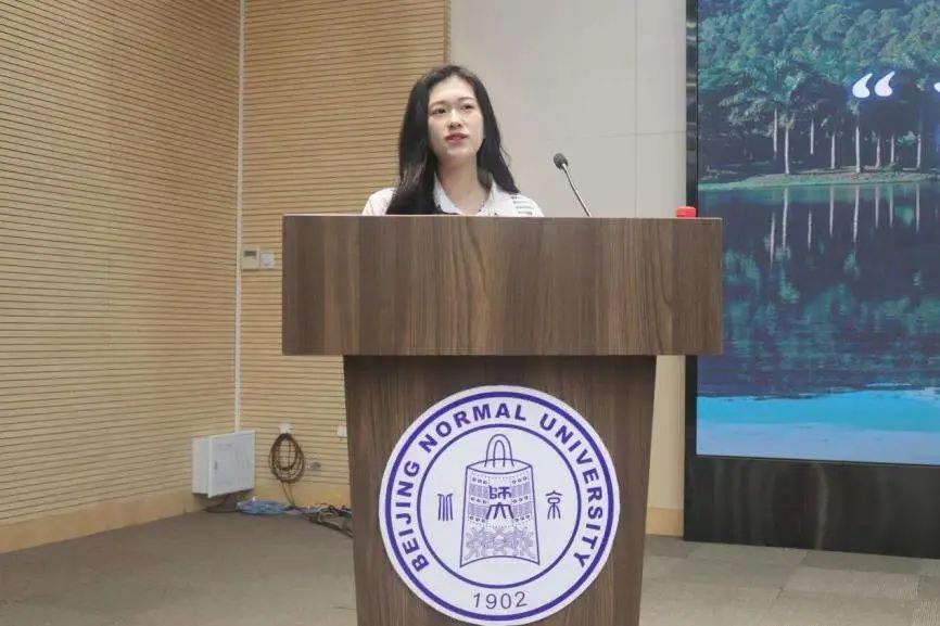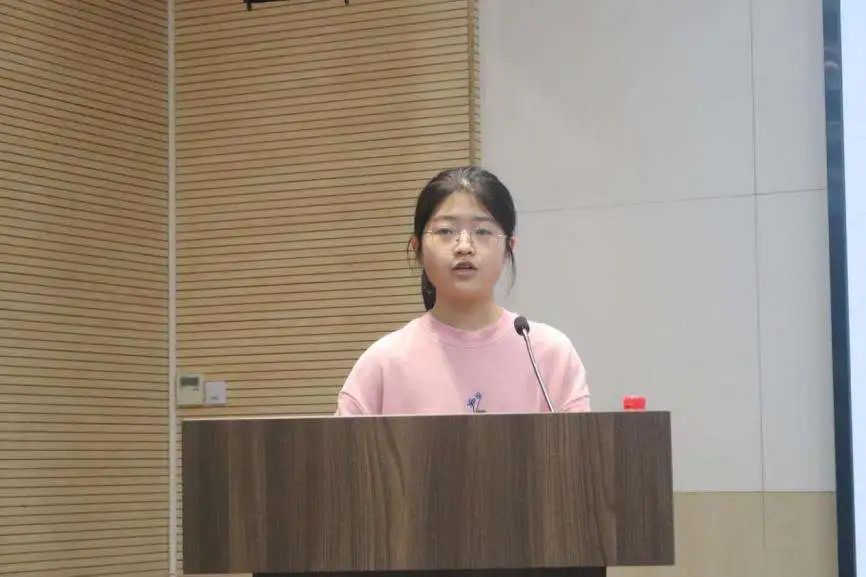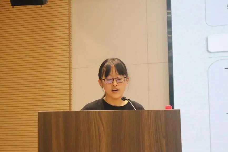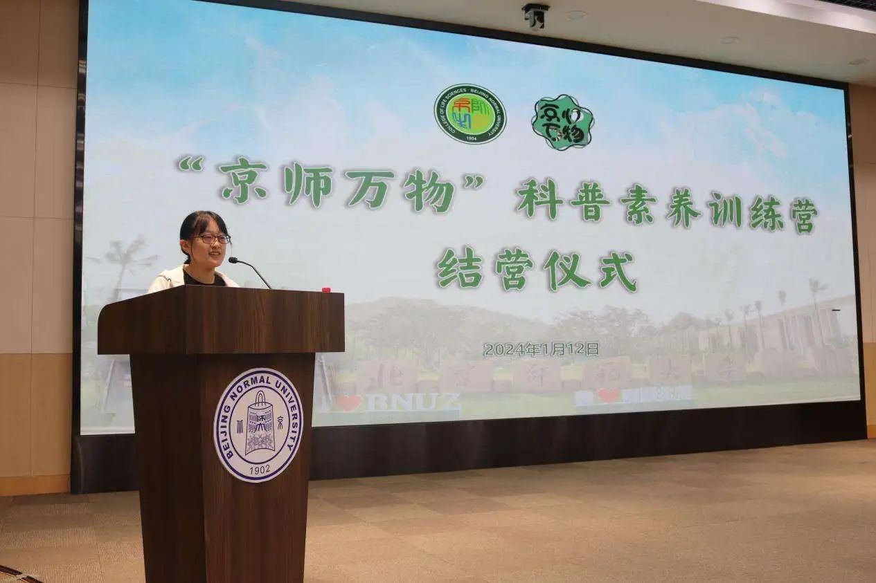 由韩雨晴同学代表北京校区学员发言。她从自己担任生物学社社长的个人经历出发,谈及自己对于生物科普工作的热情,并表示未来将继续向各位优秀的科普前辈学习,以自身所学,努力为科普教育贡献力量。
