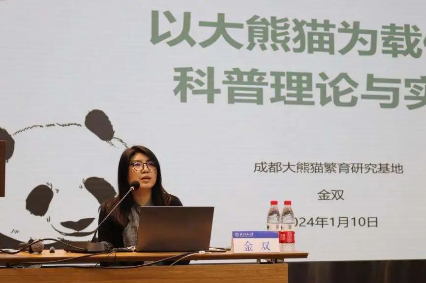 成都大熊猫繁育研究基地副研究员金双老师开展《以大熊猫为载体的科普传播理论与实践》主题讲座。金老师凭借自己与大熊猫朝夕相处的多年经验,为大家科普了许多大熊猫不为人知的奥秘。同时基于实例,讲解熊猫基地如何利用科普教育资源和人才优势,开展丰富多彩的科普教育项目,传播以大熊猫为代表的生物多样性保护理念。