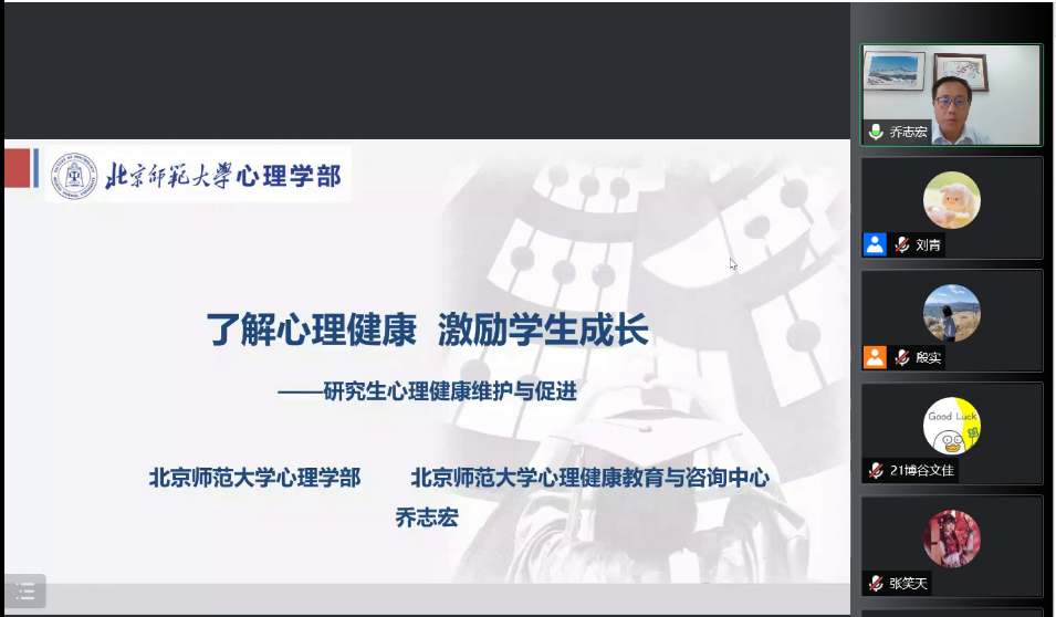 乔志宏老师的讲座从我校研究生心理健康现状、研究生常见心理问题分析和如何共同维护师生心理健康等方面展开。