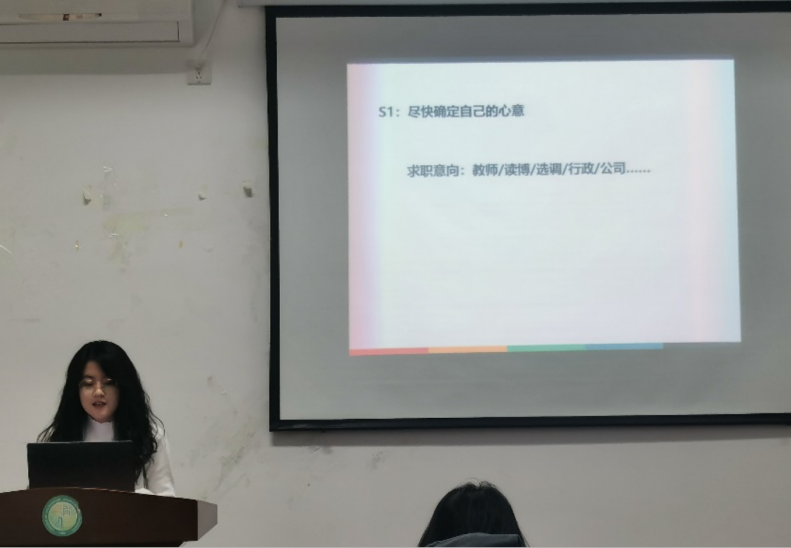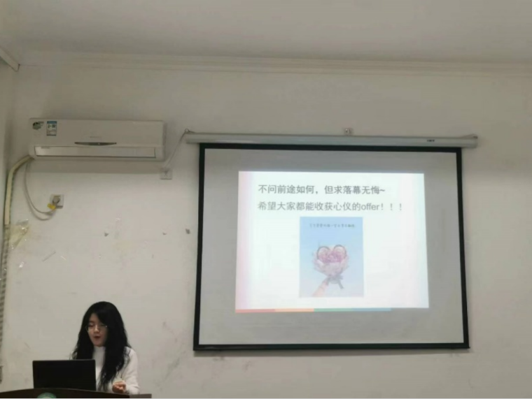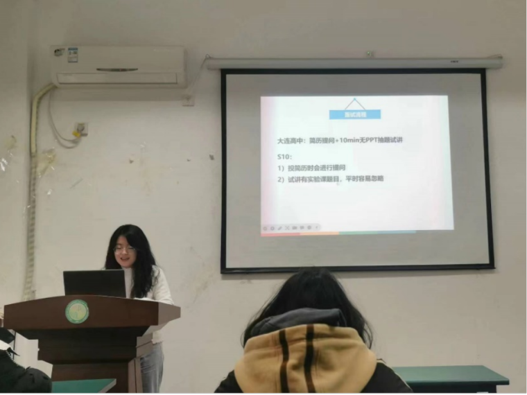 在介绍招聘准备时,孙明珠同学分别对信息获取、简历制作、材料准备和面试过程四个步骤为同学们进行了详细的介绍。