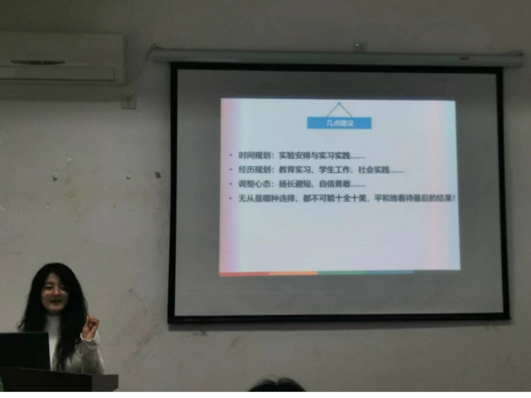 孙明珠同学还结合自身的面试经历为大家提供了几点建议:首先要合理规划时间,权衡好实验与实习实践的安排。尽力提前规划,如丰富相关教育实习、学生工作和社会实践等经历。及时调整心态,在求职时要扬长避短,自信勇敢。最后,孙明珠同学提到:不论前途如何,但求落幕无悔。鼓励同学们勇于尝试、尽力准备,同时也指出无论是哪种选择,都不可能十全十美,希望同学们能够平和地看待最后的结果,并祝愿同学们都能顺利的收获心仪的offer。
