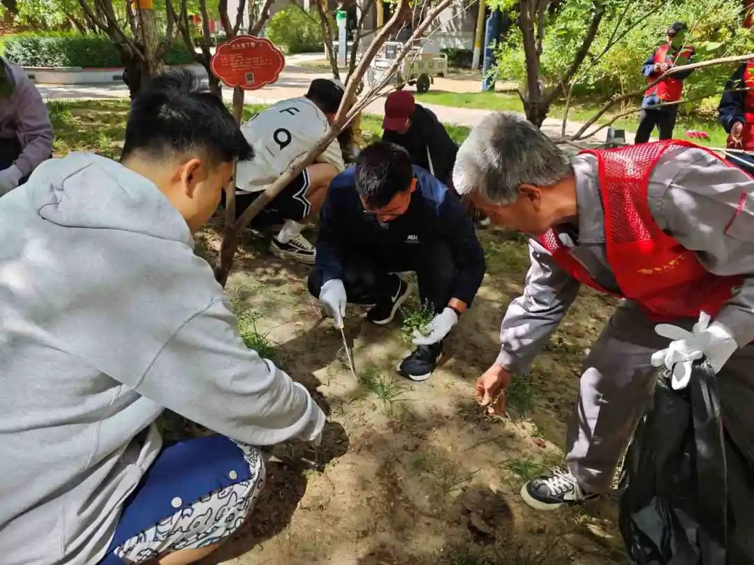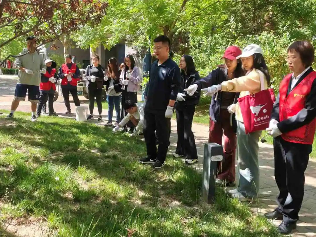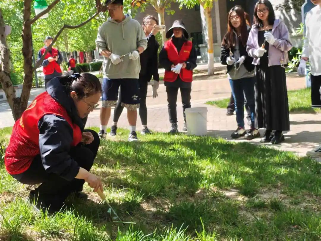 草木生香,春意正浓,2025年4月27日上午9时,2024级博士党支部联合人工智能学院硕士第三党支部于昌平校园三号公寓楼下开展“识绿护绿·我与春天合个影”校园植物科普活动。本次活动邀请到了昌平校园园林工程师进行植物的科普及养护内容的讲解,同时,五位党员加入到讲解员队伍中,结合植物学相关知识,从植物的形态特征、生活习性等方面进行补充介绍。最后,由工程师向大家介绍了除草工具,全体成员在指导下进行杂草清理。各支部共计12位党员及积极分子参与本次活动。