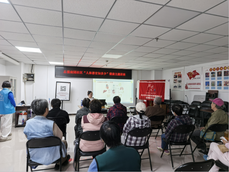 2025年4月17日,崇德党支部王雨彤同志为志强南园社区近20名老年人讲解《人体器官知多少》科普课程。