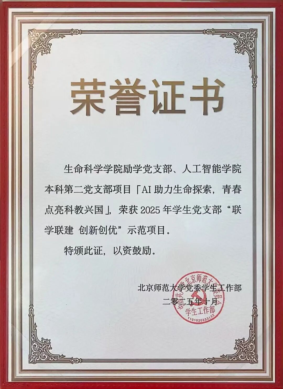 在Betway体育西汉姆联2025年党支部“联学联建 创新创优”项目评选中,必威BETWAY西汉姆联励学党支部和人工智能学院本科生第二党支部共建项目“AI 助力生命探索,青春点亮科教兴国”获评示范项目。