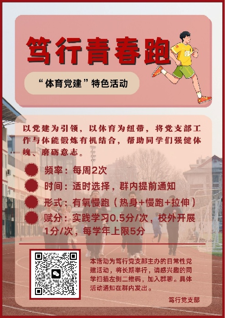 青春逢盛世,奔跑正当时!“笃行青春跑”不仅是强身健体的运动平台,更是学习交流、锤炼党性的红色阵地。无论你是运动达人还是健身新手,都欢迎加入笃行跑团!