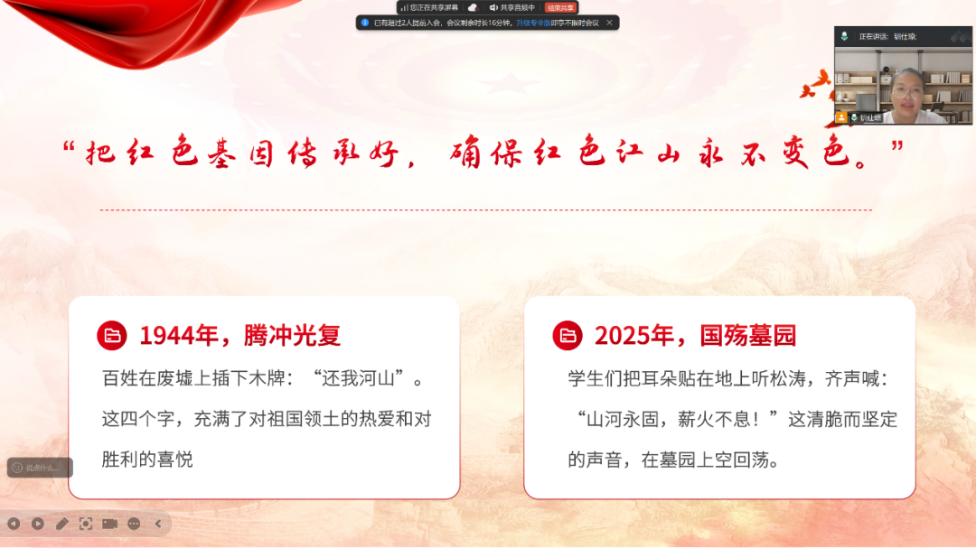 为纪念中国人民抗日战争暨世界反法西斯战争胜利80周年,传承红色基因,强化党员责任担当,8月31日21:00,励学党支部以腾讯会议线上形式开展主题党课活动。本次党课由党支部书记钏仕琼主讲,支部全体党员参与,围绕云南抗战历史、精神传承及当代青年使命展开深入交流。