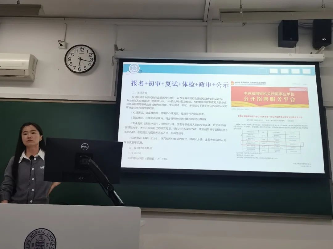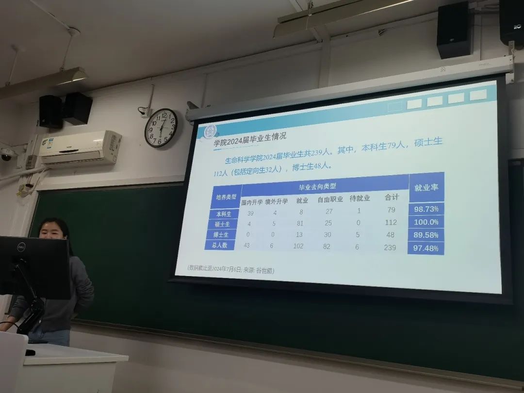 王倩倩师姐首先介绍了2024届毕业生毕业去向情况,分别从本科生、硕士生、博士生的就业情况进行介绍。师姐指出毕业生中本科生的主要去向为深造,硕士生就业率为100%,博士生主要去向为继续深造或科研助理。总体而言师姐表示对我们的就业持积极态度。