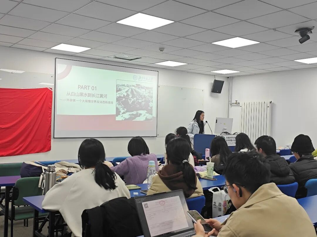 2025年12月8日晚,为纪念中国人民抗日战争暨世界反法西斯战争胜利80周年,学习习近平总书记相关重要讲话精神,求实党支部主题党日活动在生态所A105教室举行。活动与25级本科1班团支部、25级强基团支部和24级励耘团支部共办,邀请求索宣讲团讲授《东方主战场:解读抗日战争的世界历史意义》专题课,并开展了“抗战历史、抗战精神”主题研讨,49名同学在庄重氛围中回望历史、感悟精神。