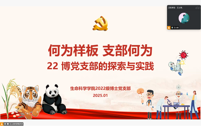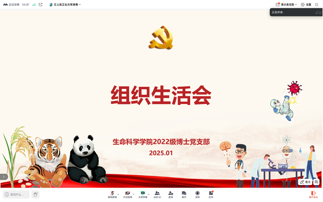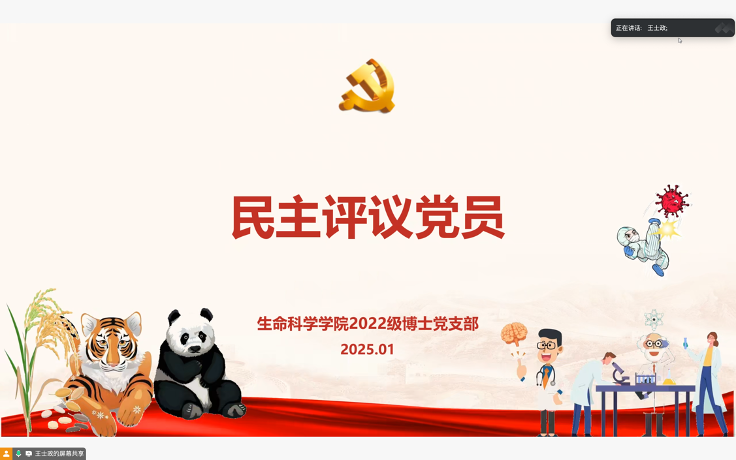 2025年1月10日晚19:00,必威BETWAY西汉姆联2022级博士党支部线上进行组织生活会,并开展民主评议党员工作,全体党员(包括预备党员)参会。会议由支部书记王士政主持。