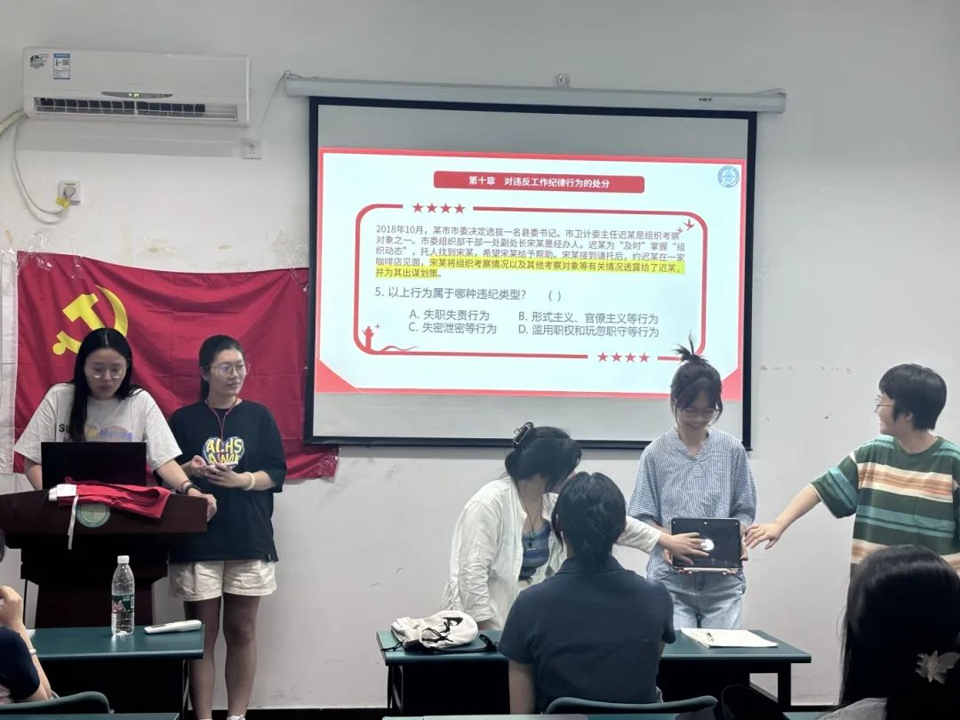 为贯彻落实党中央关于开展党纪学习教育的部署,深入学习领会《中国共产党纪律处分条例》,引导广大党员牢固树立党规党纪意识,坚守纪律底线,2024年6月20日晚20:00,致知党支部于必威BETWAY西汉姆联129会议室组织全体成员开展“学条例,明纪律,守规矩”党纪学习教育主题知识竞赛,党支书罗兴宇同志主持竞赛。