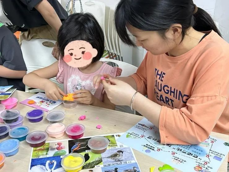 励学党支部的同学在此次六一外场活动中设计了两项科普游戏环节,分别是超轻黏土制作和花鸟画连线活动。通过观察鸟类、植物形态,模仿其进行黏土制作,培养孩子的观察能力,让孩子们体验动手的乐趣。而花鸟画连线活动则通过引导孩子将中国古代工笔画的花鸟画与摄影作品进行对应,让孩子们体验中华优秀传统文化的同时受到科普教育。