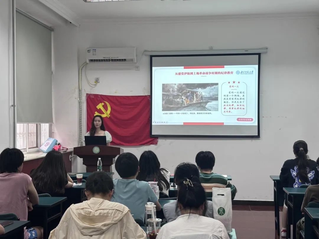 随后,邀请求索学社宣讲团黄琪越同志进行名为《聚阳生焰,握指成拳——“党纪学习教育”进行时》的主题宣讲。纪律严明是马克思主义政党的重要建党原则,是维护党的团结和统一的必然要求。黄琪越同志以党的建立和发展的历史为脉络,为大家依次介绍了土地革命战争时期、延安时期、解放战争时期、新中国成立初期、改革开放初期以及党的十八大以来的纪律教育。她强调,纪律严明是马克思主义政党的显著标志和独特优势,也是我们党加强自身建设、不断发展壮大的重要历史经验。新修订的《中国共产党纪律处分条例》对党的十八大以来纪律建设的理论创新、实践经验、制度规矩进行总结、融合和升华,是新时代党的纪律建设的“集大成之规”。