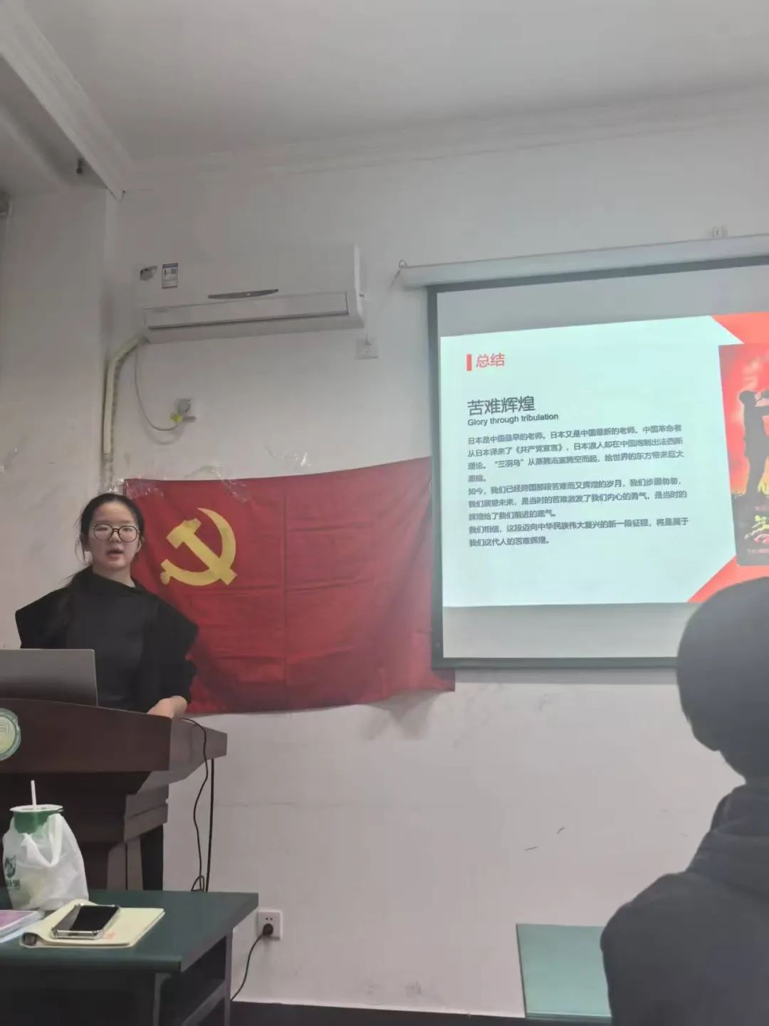 第二篇章领读由来自第二党小组的郝子琪同志进行了分享。郝子琪同志对比了中日近代化进程:两国文化同源,但面对西方冲击,日本通过明治维新全盘西化,最终走向军国主义;中国则经历洋务运动、戊戌变法和五四运动,逐步结合马克思主义与中国实际,找到“农村包围城市”的革命道路。关键差异在于改革路径——日本激进西化导致传统断裂,中国坚持“中体西用”的渐进融合。历史表明,现代化需平衡开放与传统,避免极端化,中国特色社会主义正是这一智慧的体现。