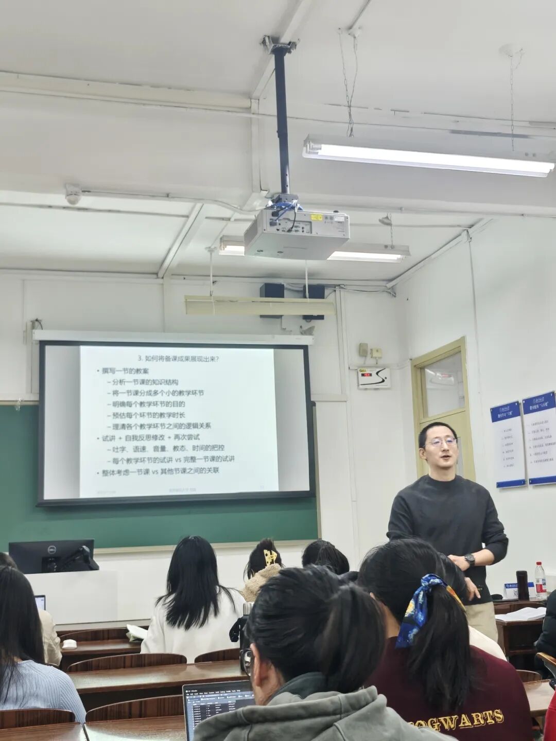 刘晟老师建议同学们,在备课完成之后,先撰写一节课程的教案,在此过程中可以分析一节课的知识结构,将一节课分成多个小的教学环节,更加明确每个教学环节的目的,理清各个教学环节之间的逻辑关系,并且在撰写的过程中还可以预估每个环节的教学时长;在撰写完成之后还可以通过试讲的方式来把控课程的内容,通过每个教学环节的试讲来完成一整节课的时间,最后联系该节课与其他课程之间的关系,完成并丰富课程内容。