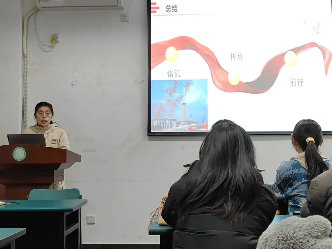 最后,杨芷若同志以《在新时代继承和弘扬伟大抗战精神》为题,分享了对伟大抗战精神的深刻理解与感悟。她通过习近平总书记的讲话回顾了抗战精神的内涵,强调了爱国情怀、民族气节、英雄气概和必胜信念的重要性。她呼吁新时代青年要从抗战精神中汲取力量,勇担历史责任,坚守道德底线,不畏困难,为实现中华民族的伟大复兴贡献青春力量。