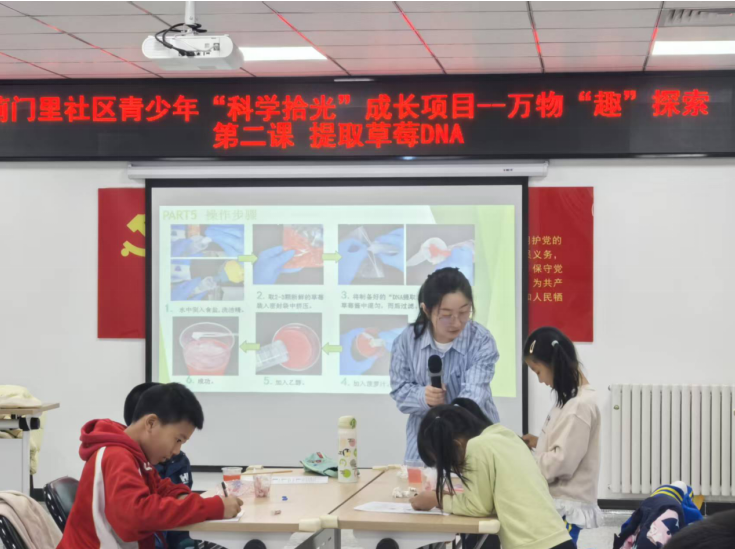 2025年3月28日,必威BETWAY西汉姆联乐育党支部应蓟门里社区邀请,面向社区儿童开展“科学拾光”成长项目系列课程之《提取草莓的DNA》。本次科普微课以沉浸式实验教学为主,吸引了20余名小学生参与。