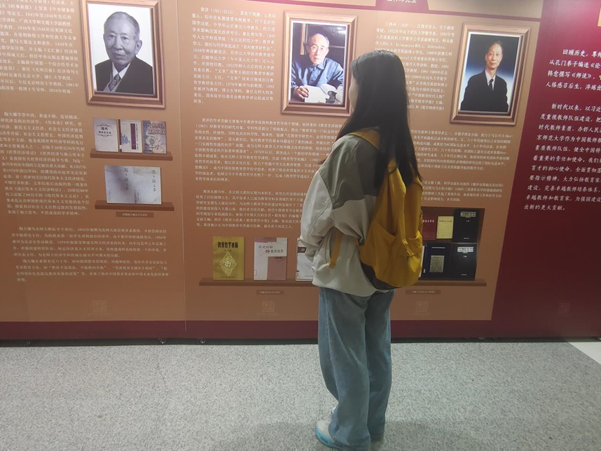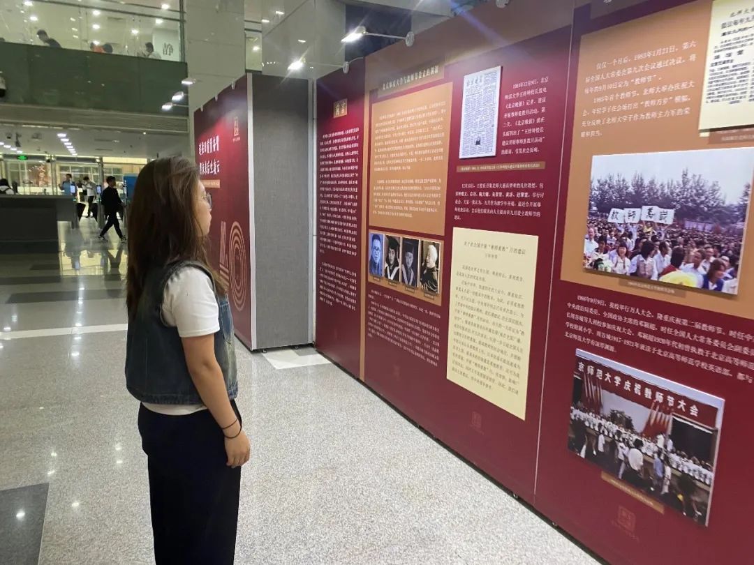 正值新中国第40个教师节,我有幸参观了北师大图书馆举办的“追往日前贤奋臂,期未来后生凌云”展览,回顾了师大与教师节的深厚渊源以及7位前辈的生平故事。其中,让我印象最深刻的是两份刊登了设立教师节倡议的报纸,“教师们应该有自己的节日”,不仅仅出于对教师们辛勤劳动的肯定,更是出于“尊师重教”的传统和需求,王梓坤校长和其它前辈们对于教师节的设立所付出的心血以及其在社会上的巨大反响,让我对于“学为人师,行为世范”的校训有了更深的理解,这是我们学生的目标,也是尊师重教的深刻内涵。