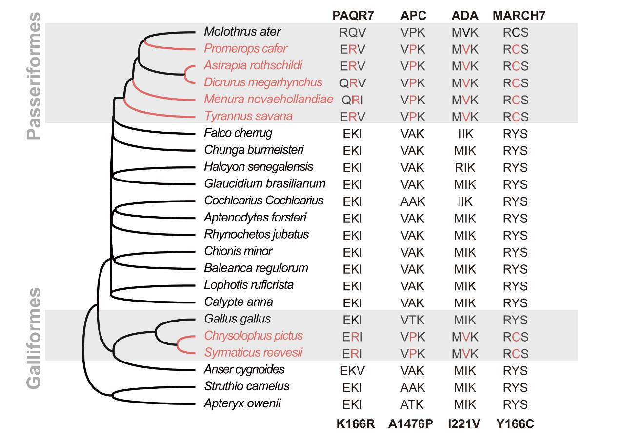 图2 长尾鸟类中的特异氨基酸趋同替换