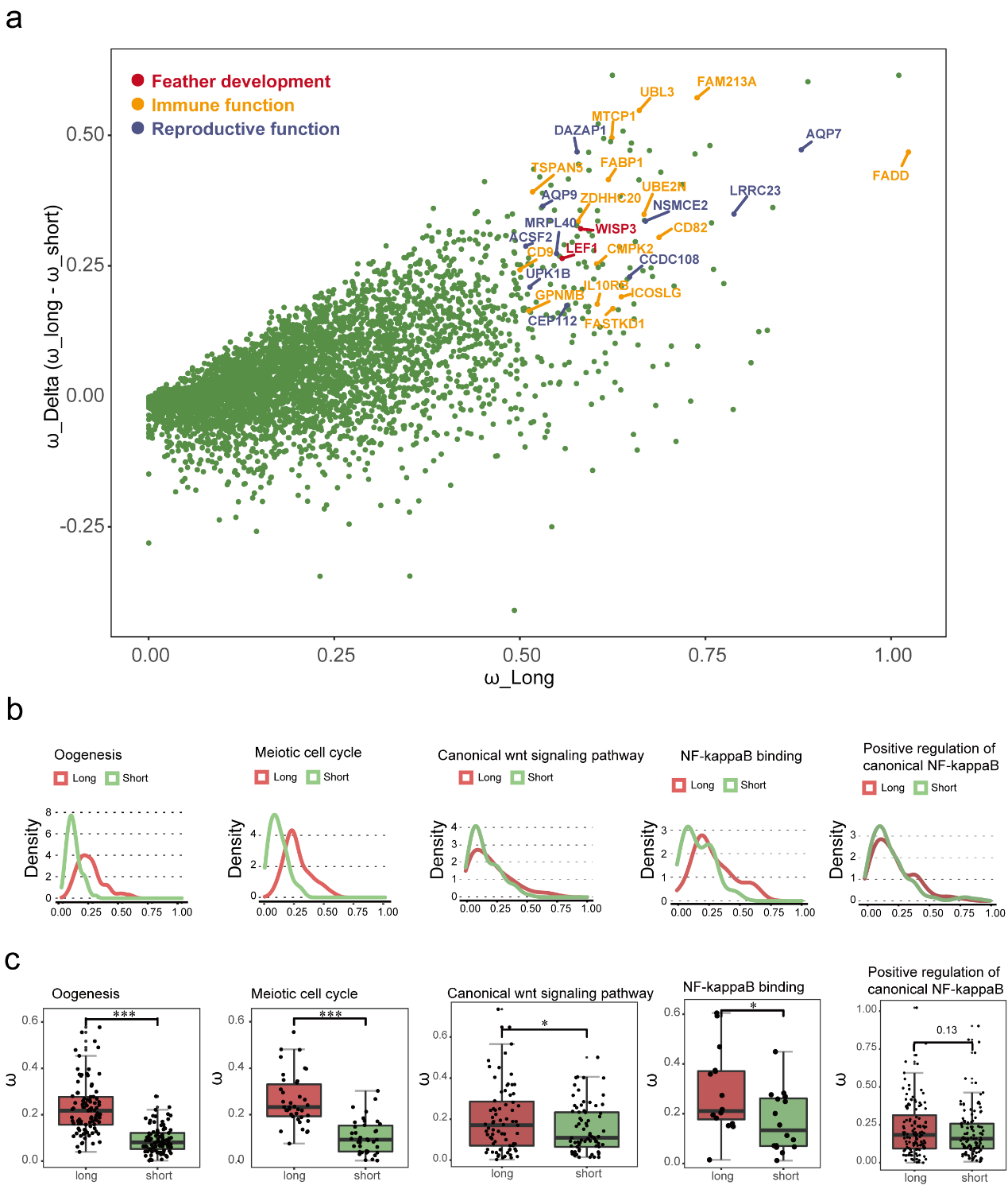 此外,研究还检测到90个在长尾类群中快速进化的基因,包括羽毛发育相关基因 LEF1 和 WISP3,以及多个与雄性生殖和免疫调控相关的基因。对功能基因集进行整体比较后,我们进一步发现 canonical Wnt signaling pathway、生殖相关基因集以及 NF-κB 相关免疫基因集在长尾鸟类中均表现出更高的整体演化速率。
