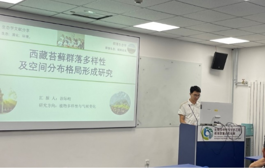 生态学2023级博士研究生谷际岐为大家带来了论坛第一期的汇报——我与西藏苔藓的故事。谷际岐首先分享了硕士阶段的工作《西藏苔藓群落多样性及空间分布格局形成研究》。他将目光聚焦于西藏苔藓上,提出了两个科学问题:西藏苔藓植物群落分布格局是由随机性过程主导还是决定性过程主导?影响西藏苔藓植物多样性和群落分布格局的主要因素是什么?谷际岐从西藏土生苔藓群落与环境因子关系、随机性与决定性在群落分布格局中的作用、树附生苔藓群落形成的驱动力分析三个方面讲述了他的研究结果。许多同学对感兴趣或有疑问的内容举手发问,谷际岐一一作了详细的解答。