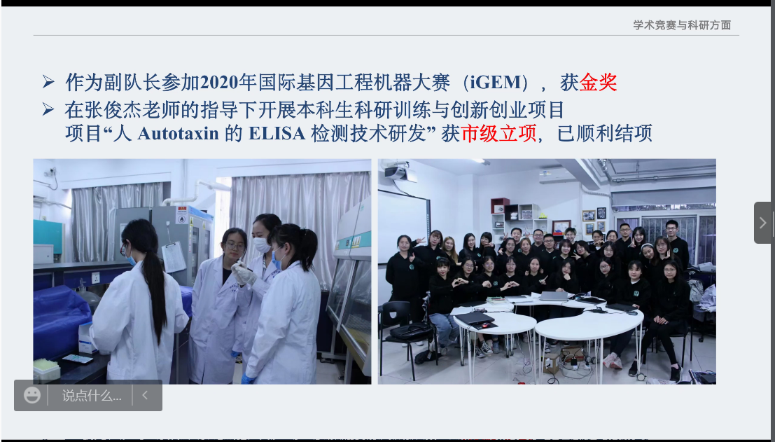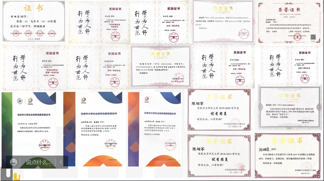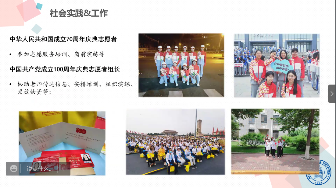 候选人根据抽签顺序分别从思想品德、专业成绩、学术竞赛和科和科研项目、社会实践和社会工作、综合素养以及突出贡献等方面展开介绍,向大家展示了自己大学四年各具特色、精彩纷呈的学习成果和课余生活。这些同学有的认真学习专业知识,成绩一直排名专业第一;有的积极投身科研工作,参与多个课题项目;有的热心公益,大学四年志愿服务时长超600小时;有的积极参与学生工作,屡获多项社会工作荣誉。