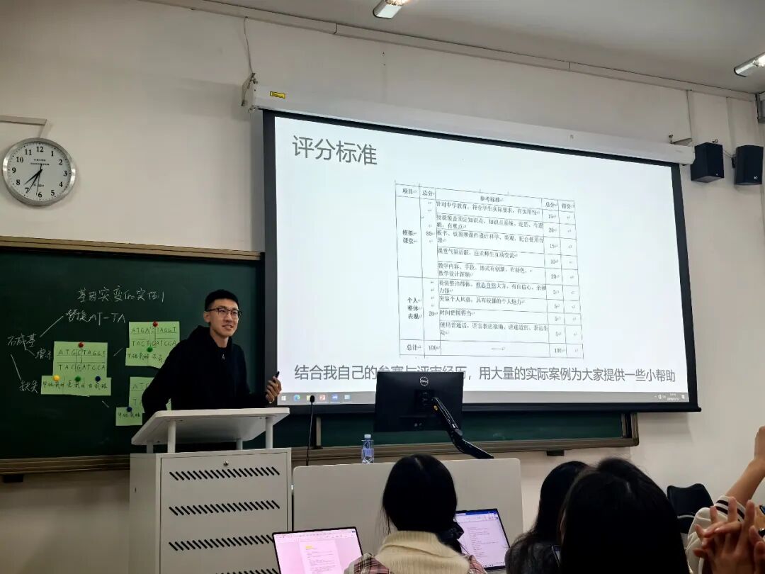 最后,葛丁赫师兄为我们展示了自己去年参赛的试讲片段《基因突变的实例——生命故事中的“意外转折”》并分享了他的参赛心得。葛师兄以幽默风趣的风格给大家留下了深刻的印象,同时他详细地讲解了如何制作PPT、写板书、如何互动等关于比赛的细节和规范的内容,让大家获益良多。