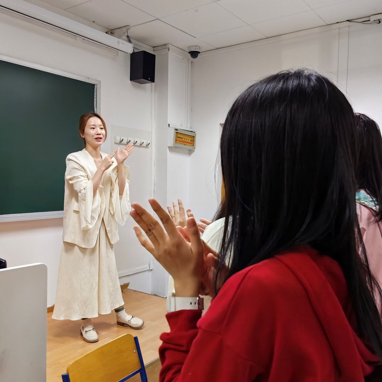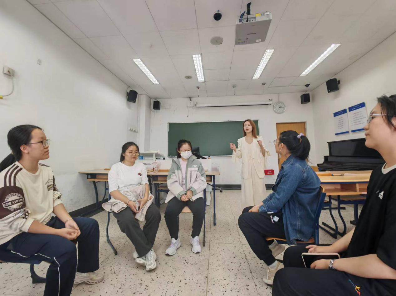 活动开始,时天婵老师让同学们围坐成一个大圈。为缓解一天忙碌下来的疲惫感,老师先让我们做了一个小小的热身运动——用自己的身体去模拟大自然。“起风了”“小雨”“大雨”“暴风雨”,我们用掌声、跺脚与尖叫去模仿那热烈而奔放的自然之声,便也逐渐忘记了繁忙的学习、工作任务和生活中的烦恼,唤醒疲倦的心灵,以更加饱满的热情投入这次活动中。