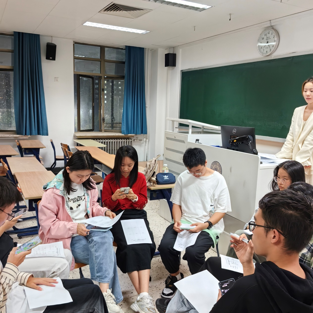 活动开始时,时老师首先进行了一个简单轻松的小游戏,缓解了大家的紧张情绪,教室里渐渐有了欢乐的气氛。由于人数有限,老师让所有人共同成立一个大组,并推选出组长。组长带领大家创造了组名以及组规,课堂进入正式的活动环节。