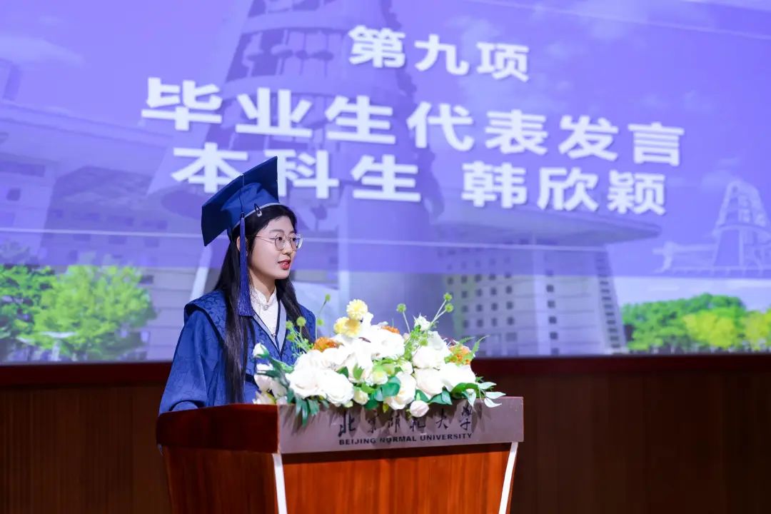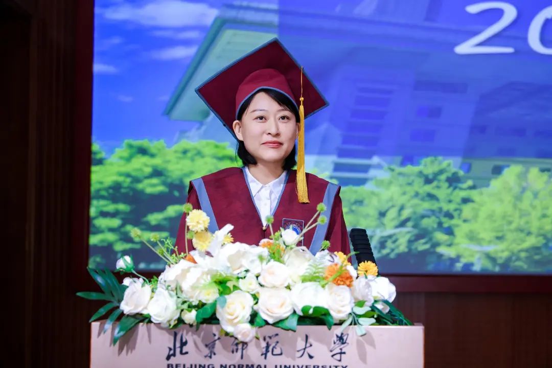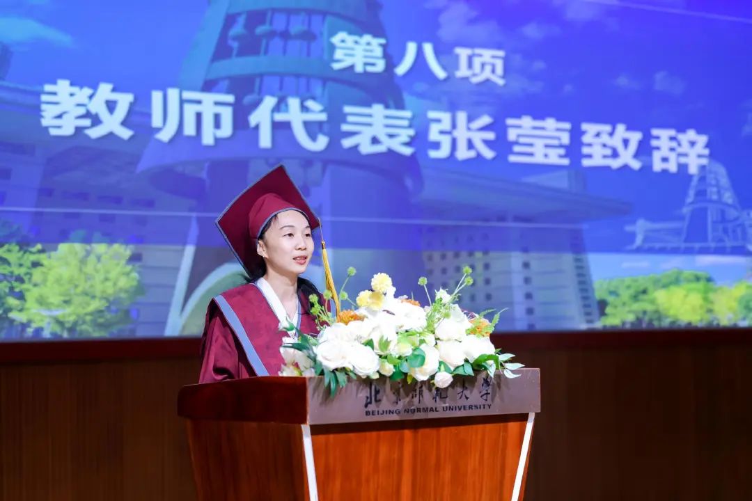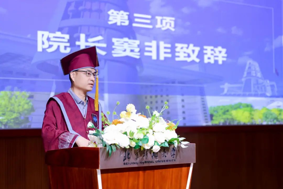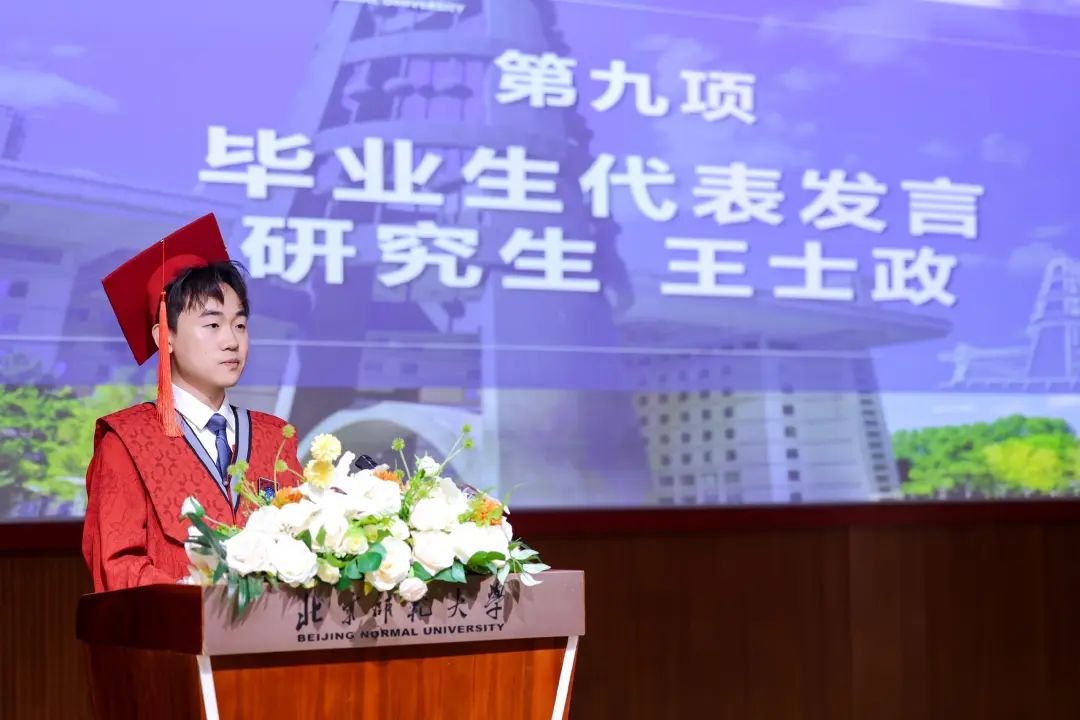 王士政同学作为研究生毕业生代表发言。王士政同学回首了“在行动中破局,在专注中扎根”的五年师大学习时光,表达了对学院科研平台、导师同门们深深的感谢。王士政同学表示,站在新的人生起点,我们将带着在师大沃土中扎根汲取的力量继续向前,在各自的领域里,努力成为一束照亮他人的微光。