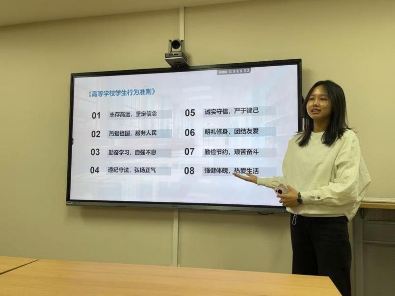 第二部分是“知规守纪,行稳致远”主题班会。首先,许雯华向大家介绍了《高等学校学生行为准则》,列举了《普通高等学校学生管理规定》等一系列有关学生行为准则的材料,并向同学们推荐了《Betway体育西汉姆联学生手册(2024年版)》等北师大学子当之无愧的“学习宝典”和“生活宝典”,推荐同学们阅读学习。