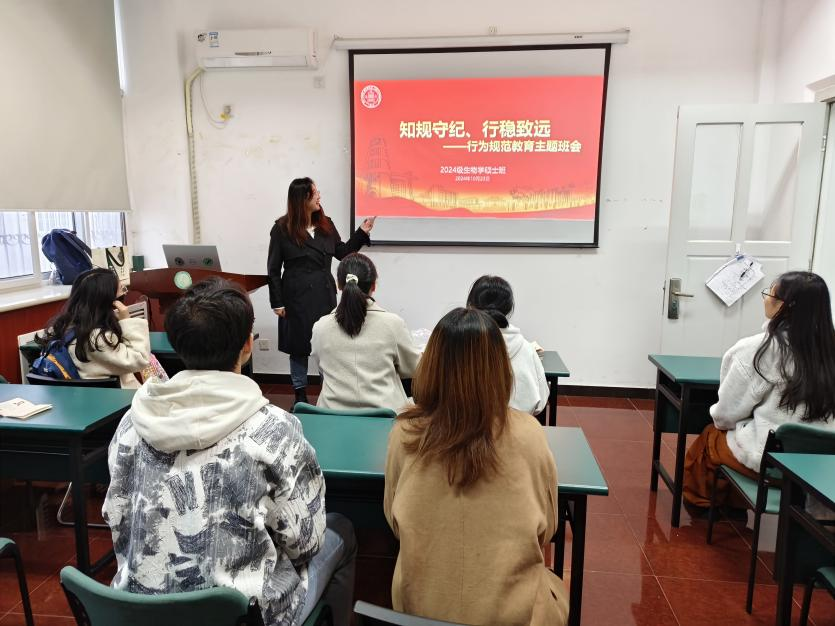 2024年10月23日2024级生物学硕士班举办了一场以“知规守纪、行稳致远”为主题的行为规范教育班会。