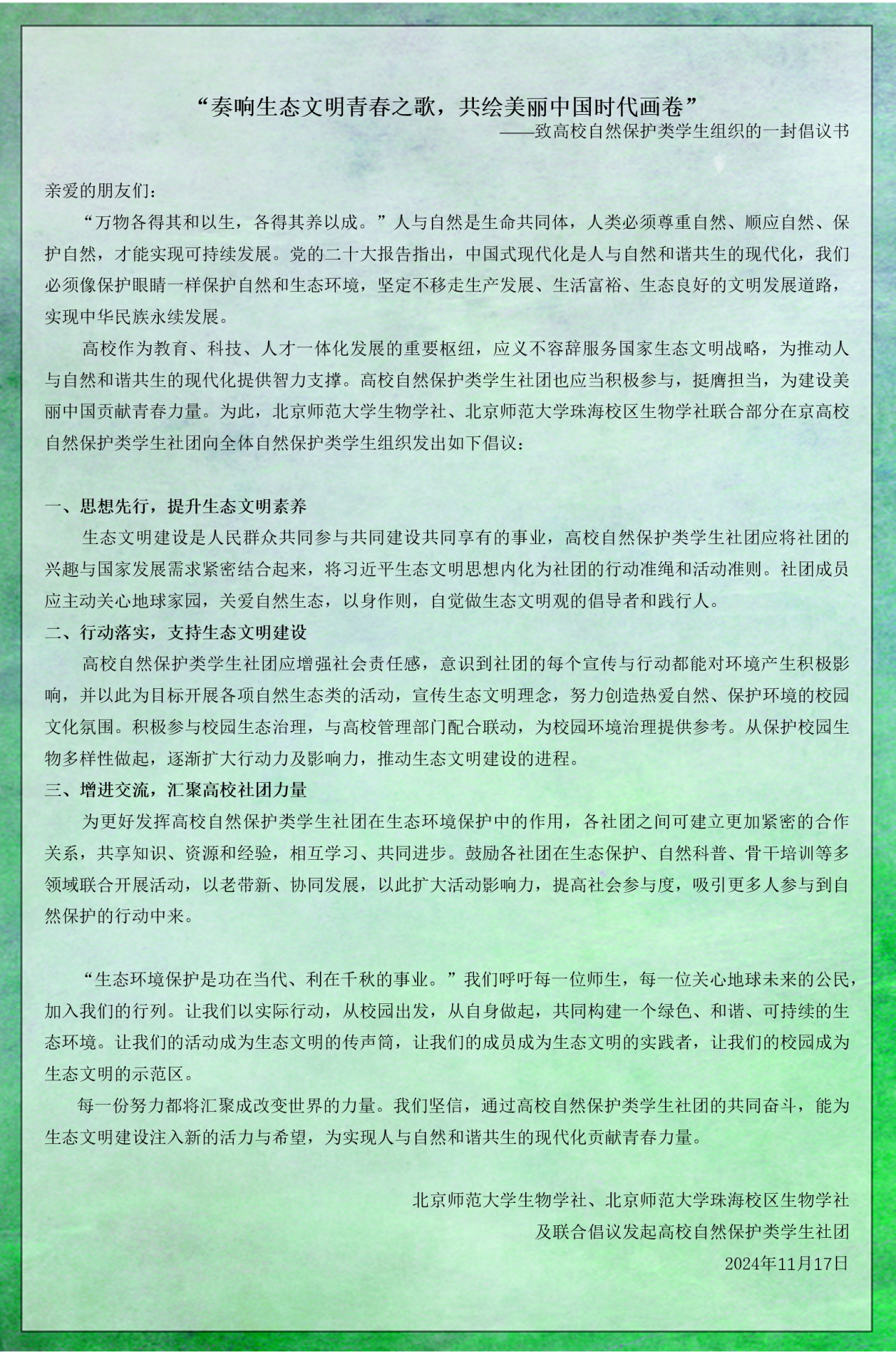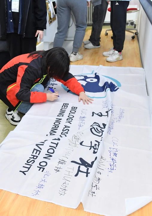 活动最后,为进一步促进北京高校自然保护类学生社团之间的合作与发展,16所发起高校学生社团负责人用在生物学社社旗上签名的方式,共同发布了联合倡议书。生物学社社长黄煜娟同学宣读倡议,并表示,生物学社将和其它发起高校学生组织一道,引领广大同学树立生态文明理念,共同绘制美丽中国的时代画卷。