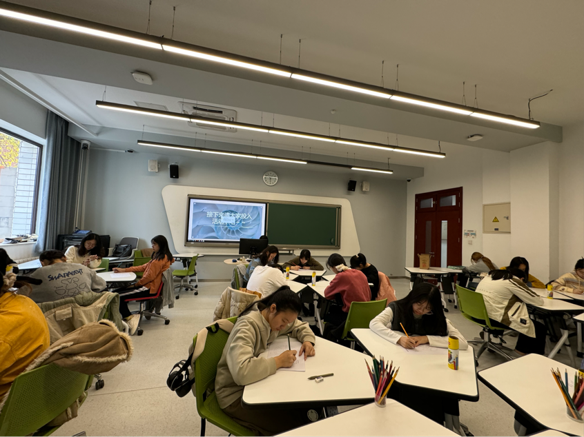 带领者让同学们跟随音频进行冥想,同学们闭上眼睛,感受身体与椅子的接触,再把注意力集中到自己的呼吸上,冥想过后,同学们有序领取图纸进行作画。
